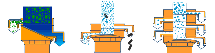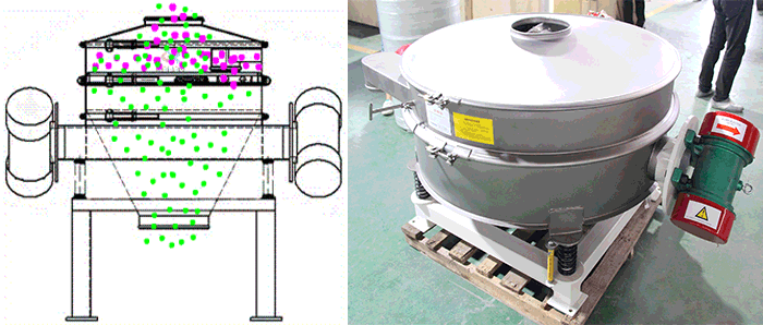 直排篩主要適用于物料大處理量除雜、疏松,設備安裝一層篩網將成品料與大雜質分離,通過振動篩電機產生激振力晃動篩框,物料迅速通過篩網在位于篩機正下方的成品料出口排出,物料直接排放有更大的處理量,達到很好的篩分效果。
