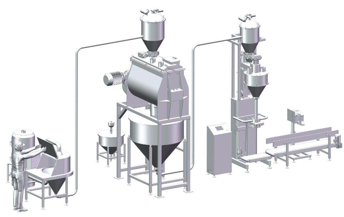 當小袋物料需要拆包倒入下道工序時,只需人工直接拆包放入系統(tǒng)即可。給料過程中產(chǎn)生的物料粉塵由除塵風機收集。物料通過振動篩(安全篩)攔截散狀物料和異物,保證符合要求的顆粒順利輸入。