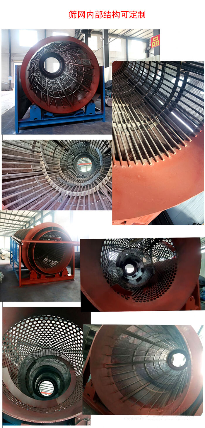 重型滾筒篩的結(jié)構(gòu)相對(duì)簡(jiǎn)單,主要由滾筒裝置、電動(dòng)機(jī)、減速機(jī)和篩網(wǎng)等組成。滾筒裝置傾斜安裝于機(jī)架上,電動(dòng)機(jī)通過減速機(jī)與滾筒裝置連接,驅(qū)動(dòng)滾筒繞其軸線轉(zhuǎn)動(dòng)