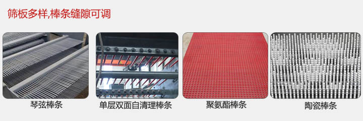 2,該設(shè)備篩板多樣:琴弦棒條,單層雙面自清理棒條,聚氨酯棒條,陶瓷棒條四類。