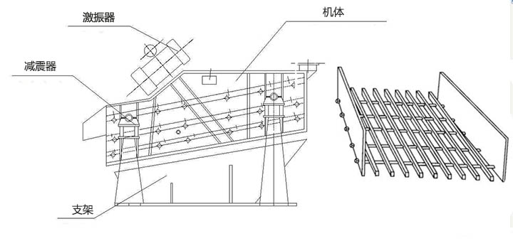 棒條篩工作時(shí),由激振器產(chǎn)生的激振力通過(guò)篩箱傳遞給篩箱內(nèi)的篩面上,因激振器產(chǎn)生激振動(dòng)力為縱向力,迫使篩箱帶動(dòng)篩網(wǎng)面作縱向前后位移。在一定條件下,篩網(wǎng)面上的物料因受激振力作用而被向前拋起,落下時(shí)小于篩孔的物料則透篩而落到下層,物料在篩網(wǎng)面上的運(yùn)動(dòng)軌跡為拋物運(yùn)動(dòng),由于這樣周而復(fù)始的物料運(yùn)動(dòng),從而完成物料篩分作業(yè)。