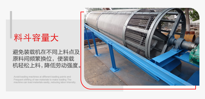 4.儲料斗容量大,使裝載機(jī)合理安排主設(shè)備(如攪拌站)與篩砂機(jī)的上料時間,避免裝載機(jī)在不同上料點(diǎn) 及原料間頻繁換位,使裝載機(jī)輕松上料,降低勞動強(qiáng)度。