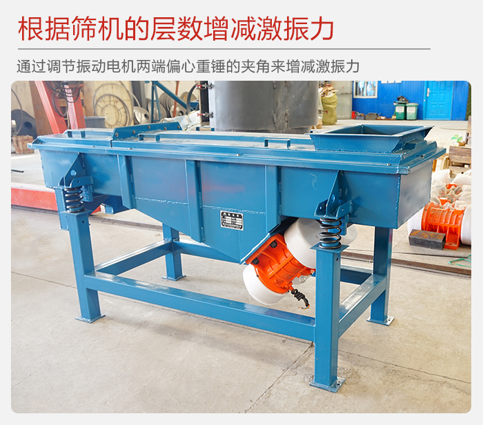 5、用戶可根據(jù)篩機的層數(shù),物料比重不同來增減篩機的激振力(通過調(diào)節(jié)振動電機兩端偏心重錘的夾角來增減激振力),使篩機達(dá)到最佳的篩分效果。