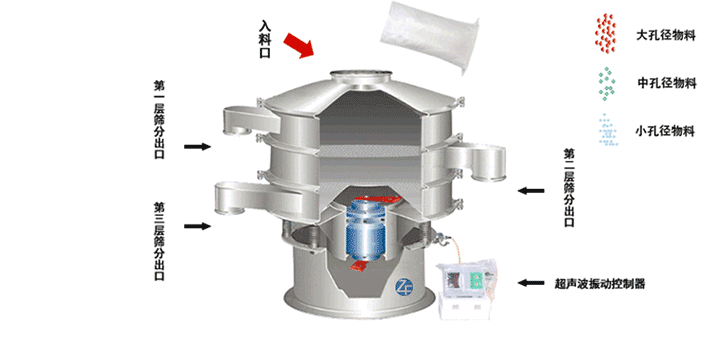 超聲波振蕩篩在直立式振動電機(jī)與超聲波換能器的共同作用下,實(shí)現(xiàn)物料的篩分/分級目的。直立式振動電機(jī)作為激振源,帶動物料和篩網(wǎng)的振動的同時,超聲波換能裝置實(shí)現(xiàn)對物料靜電,易聚團(tuán)的抑制,保證物料的松散從而實(shí)現(xiàn)物料的篩分目的。